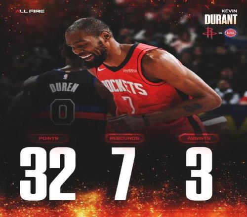37岁老杜兰特太累了!背靠背苦战85分钟狂抡死神镰刀率领火箭队强强对话力擒东部老大活塞,4大原因让他一秒也不...