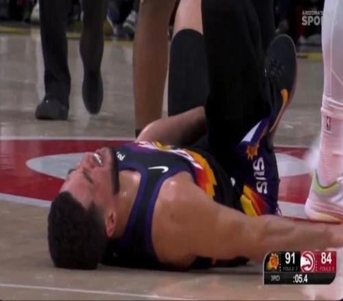 本场比赛,太阳队除了输球之外还两度遭遇球员伤情。在后,德文-布克在第三节最后时刻也遭遇伤情:他在太阳队最后一攻时注意力完全放在了后场推进的队友身上,结果却没看到身前的老鹰球员,右脚踩到了对方的脚造成90度崴脚。倒地后的布克表情非常痛苦,最终他在队友和工作人员的帮助下起身并回到了更衣室,最终他也提前退场。