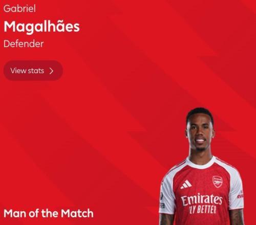 英超第22轮,阿森纳客场0-0战平诺丁汉森林,阿森纳后卫加布里埃尔当选全场最佳球员。